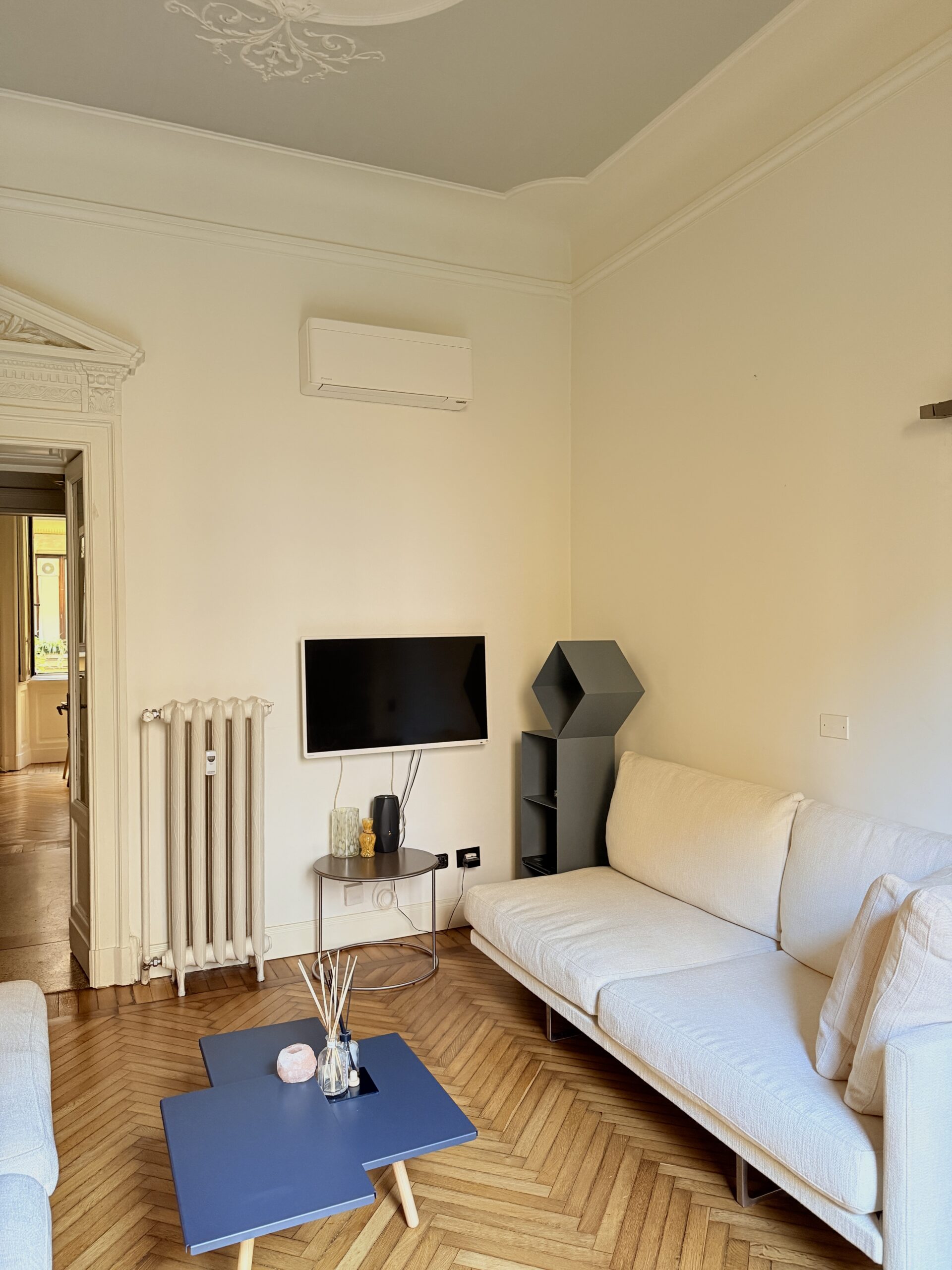 L’appartamento è molto silenzioso. È dotato di aria condizionata e il riscaldamento è in parte centralizzato ed in parte autonomo. Viene affittato arredato e corredato.