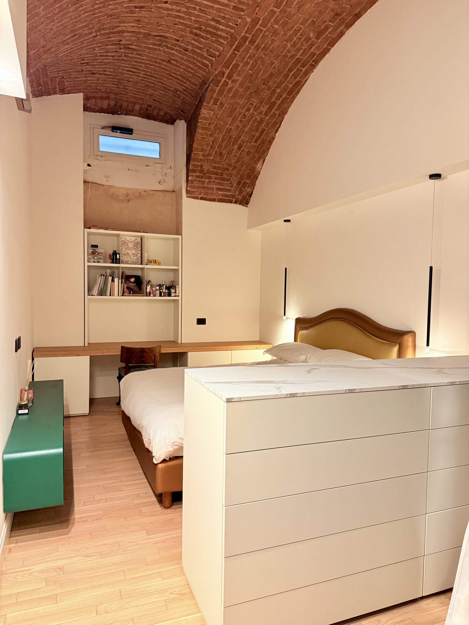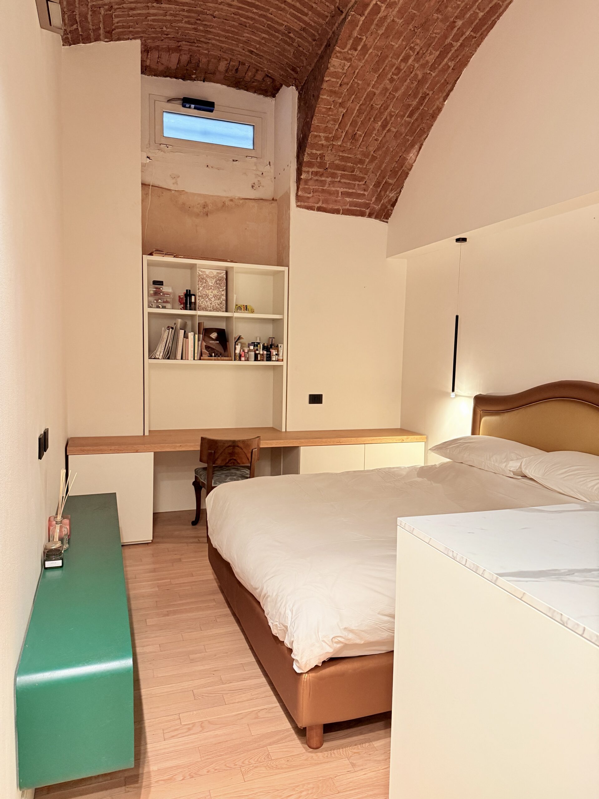 Al piano rialzato, con doppia esposizione interna, si trova l’ingresso da cui si accede alla zona living con affaccio sul giardino attrezzato e arredato, alla cucina abitabile e ad un bagno per ospiti. Una scala interna porta alla grande camera da letto matrimoniale seminterrata con soffitto alto a volta di mattoni, ad un secondo bagno con grande box doccia e ad una zona ripostiglio.