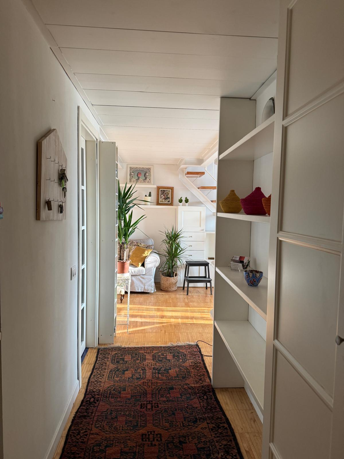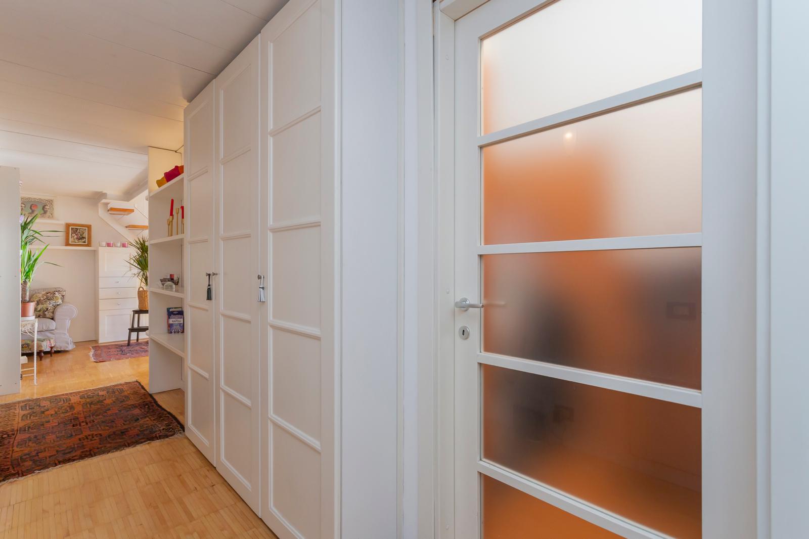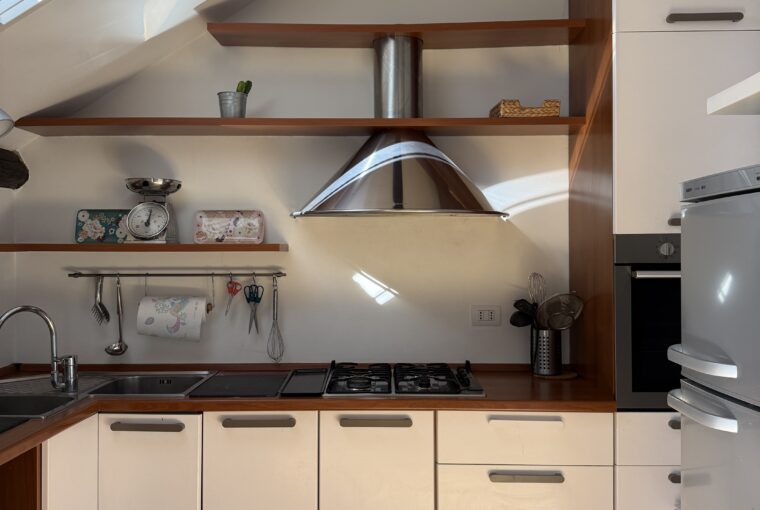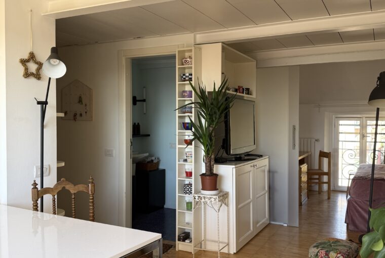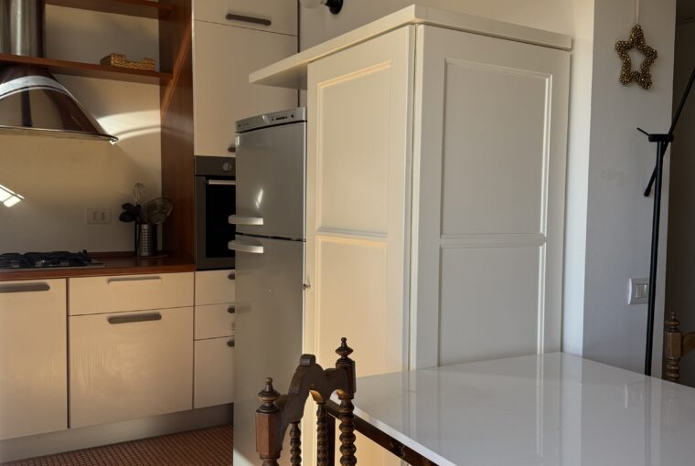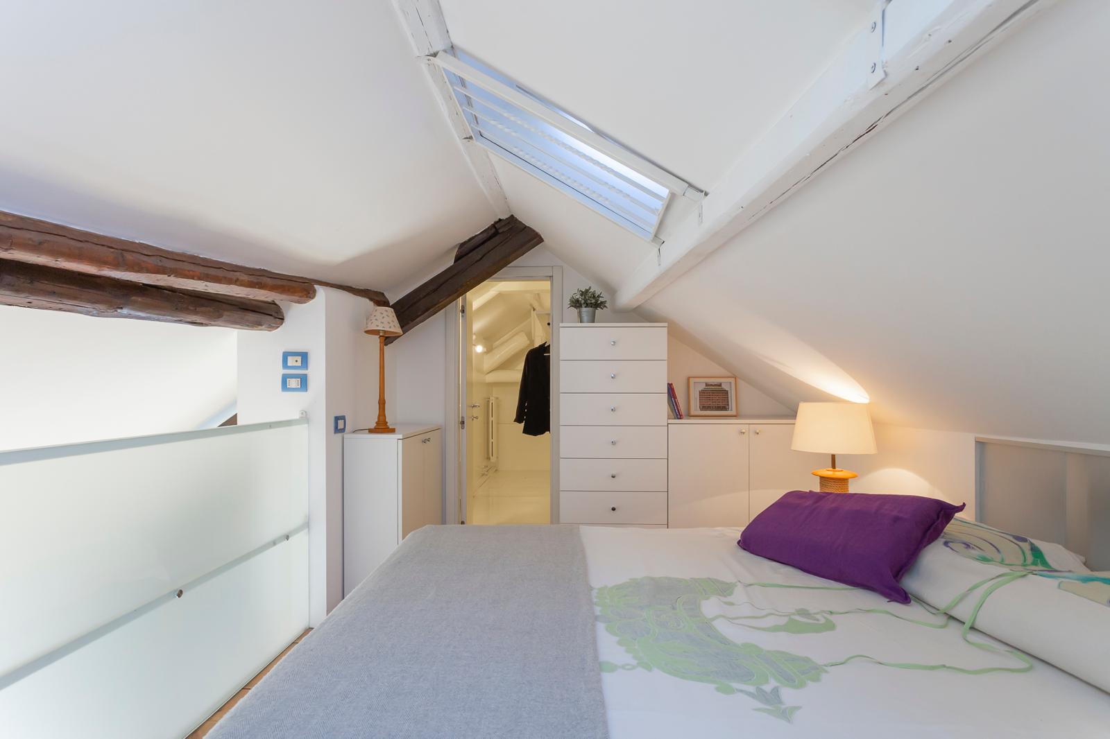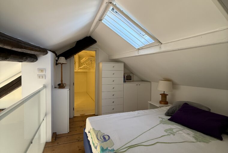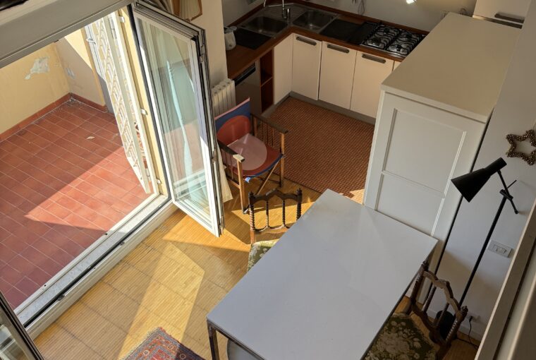 L’appartamento si sviluppa su due livelli: al primo, ampia zona giorno con cucina a vista attrezzata di tutti gli elettrodomestici, armadi a muro, una stanza studio con letto alla francese (separata dal soggiorno da una porta a vetri), il bagno e la lavanderia; al secondo livello, la stanza con letto matrimoniale e un’ampia cabina armadio.