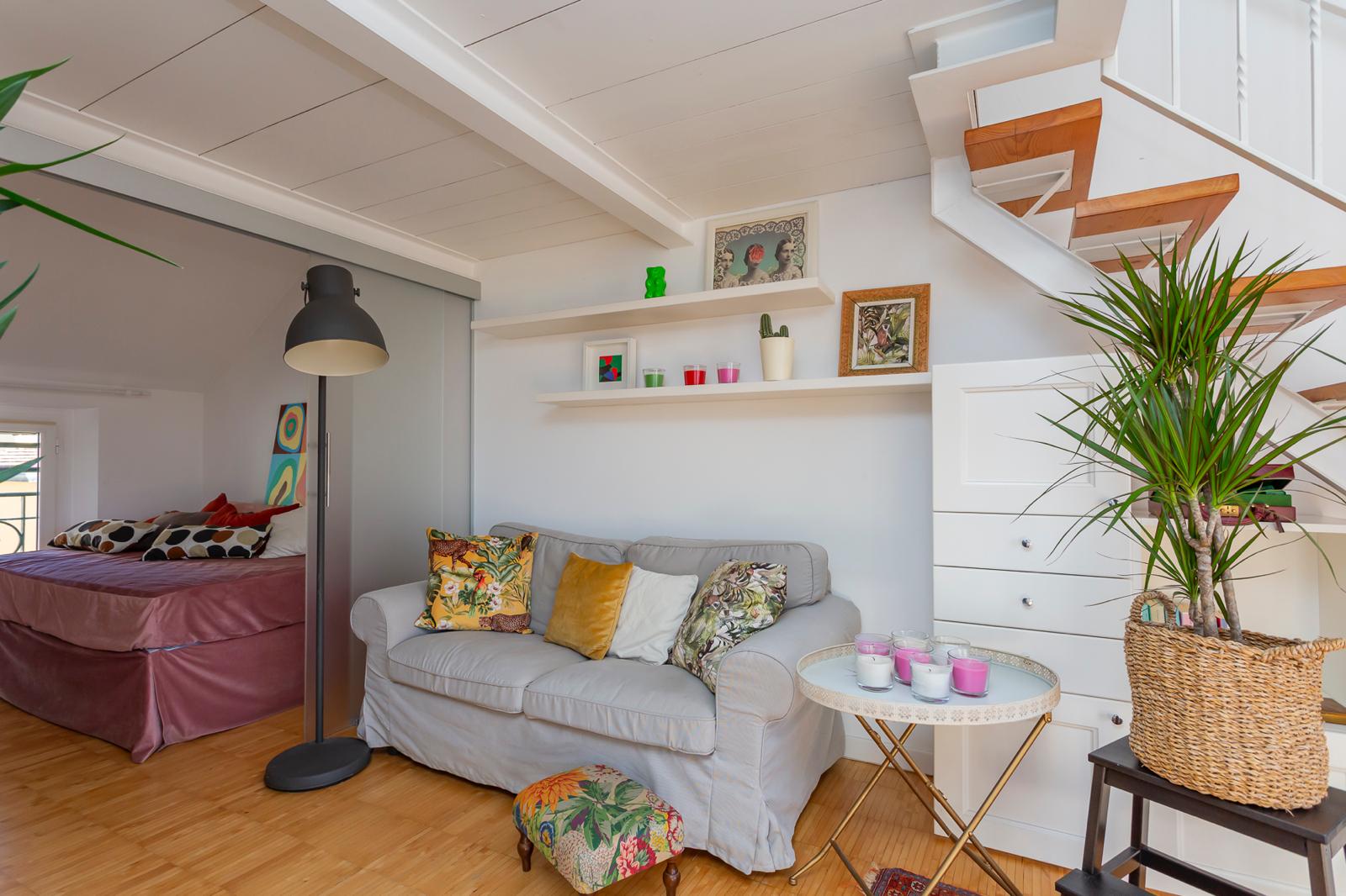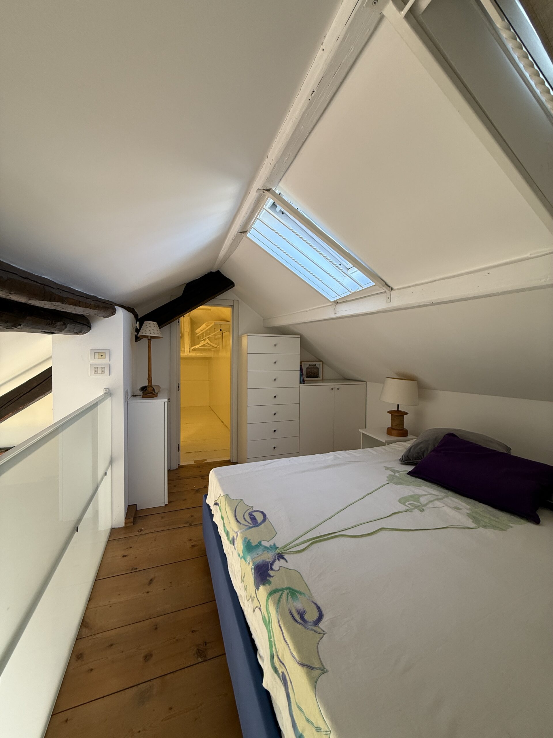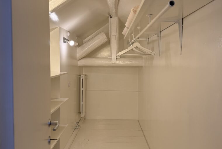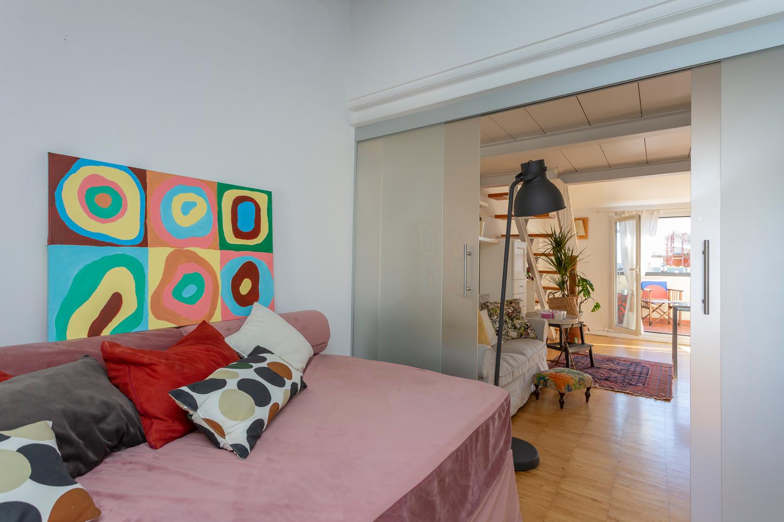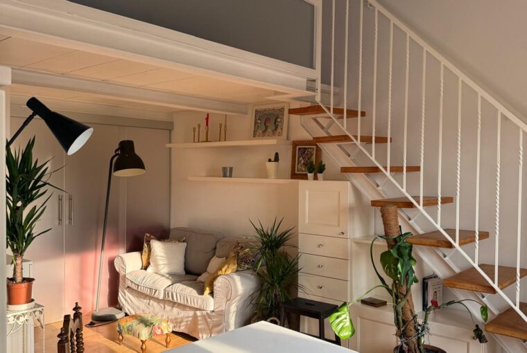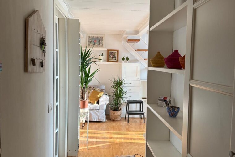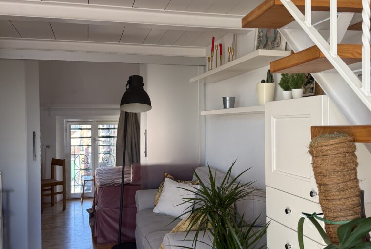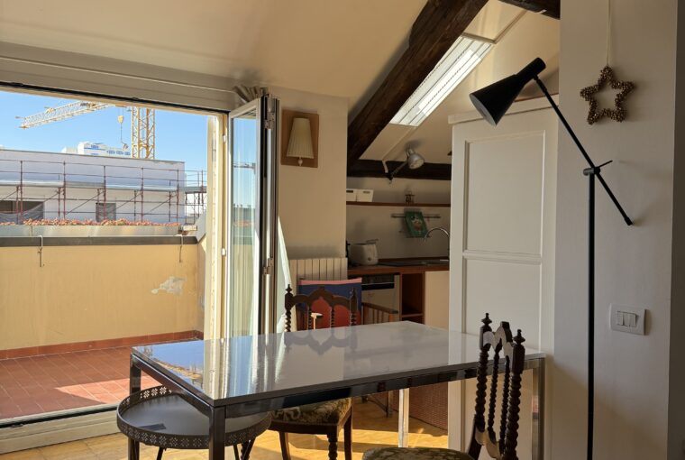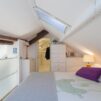 L’appartamento si sviluppa su due livelli: al primo, ampia zona giorno con cucina a vista attrezzata di tutti gli elettrodomestici, armadi a muro, una stanza studio con letto alla francese (separata dal soggiorno da una porta a vetri), il bagno e la lavanderia; al secondo livello, la stanza con letto matrimoniale e un’ampia cabina armadio.