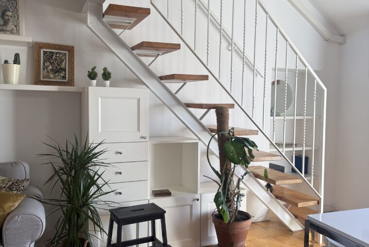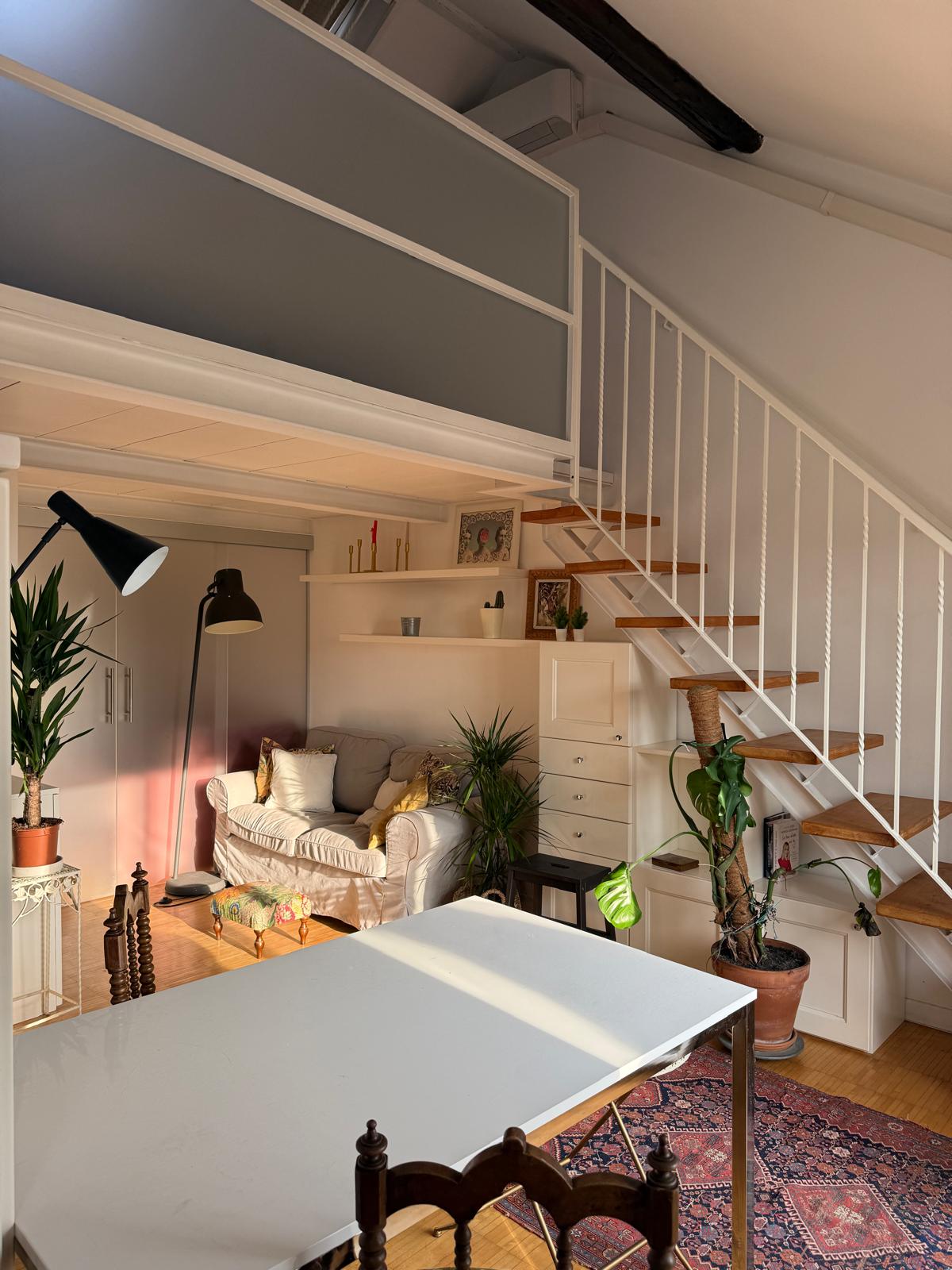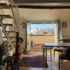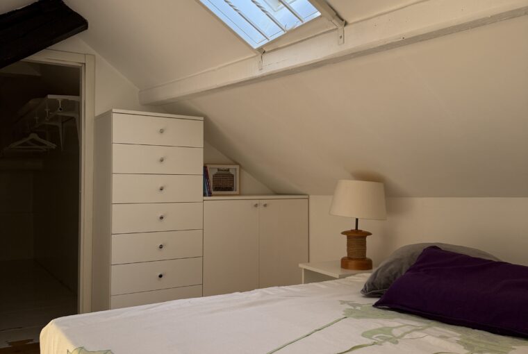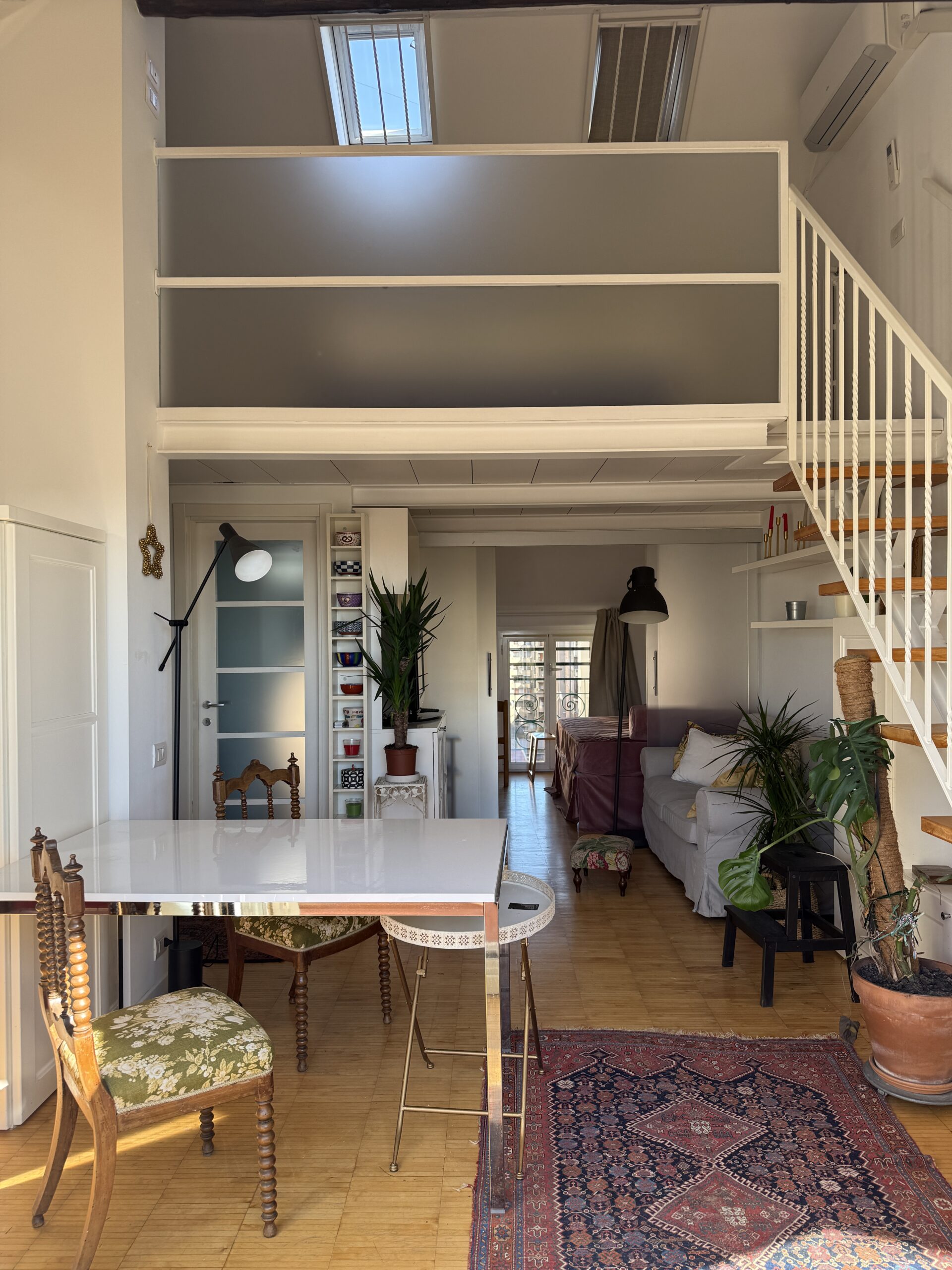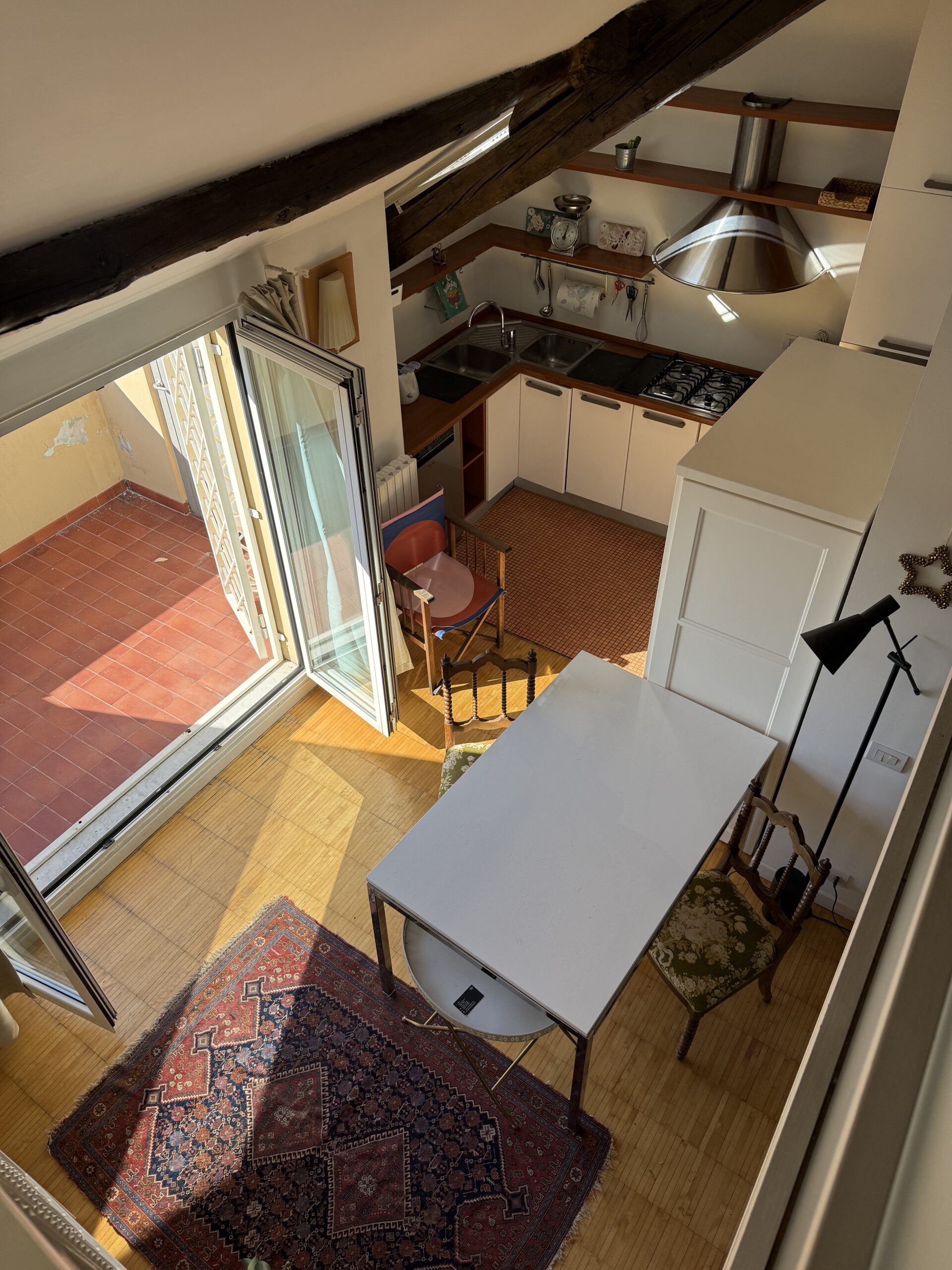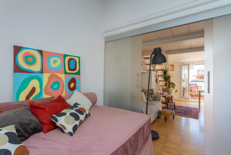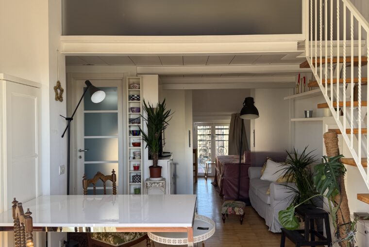 L’appartamento si sviluppa su due livelli: al primo, ampia zona giorno con cucina a vista attrezzata di tutti gli elettrodomestici, armadi a muro, una stanza studio con letto alla francese (separata dal soggiorno da una porta a vetri), il bagno e la lavanderia; al secondo livello, la stanza con letto matrimoniale e un’ampia cabina armadio.