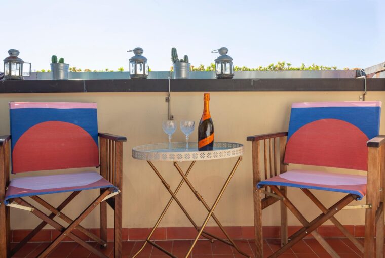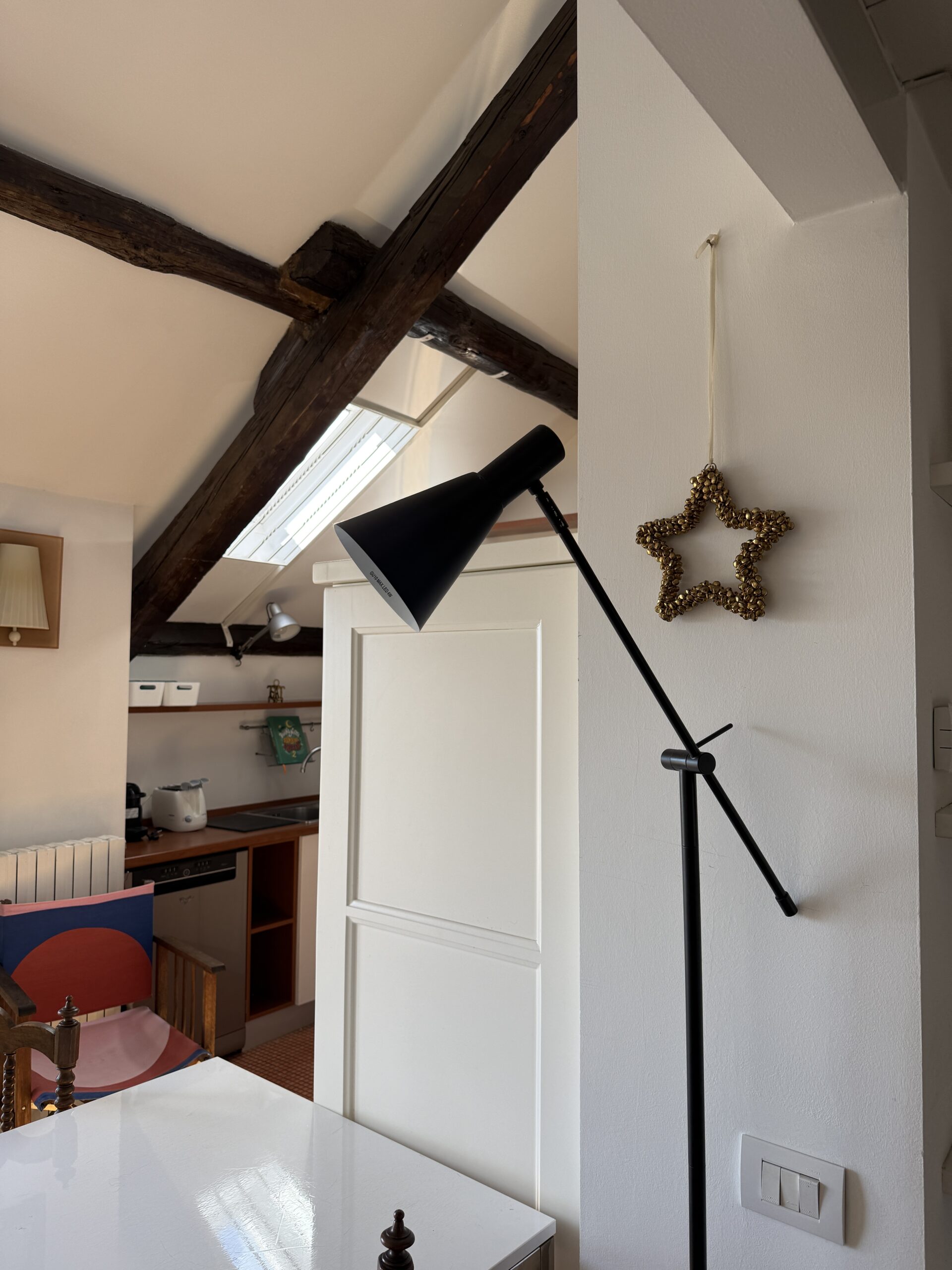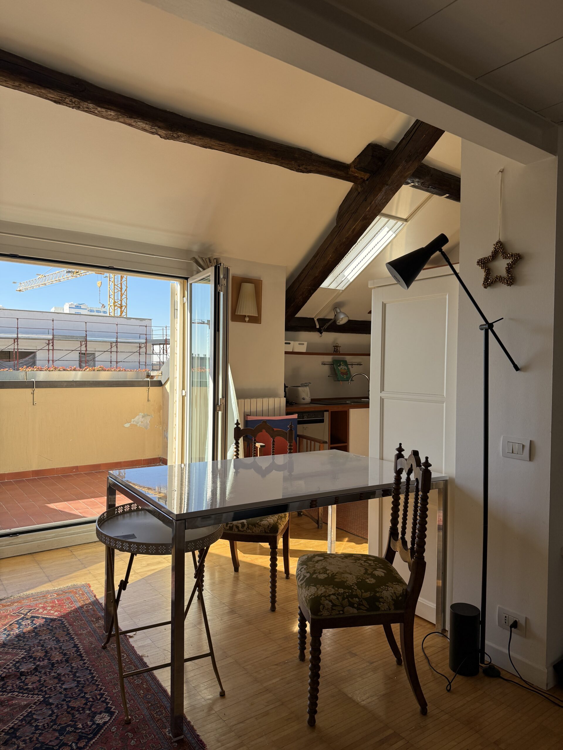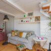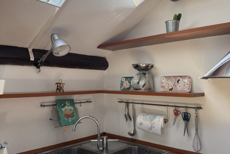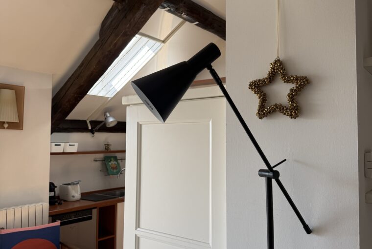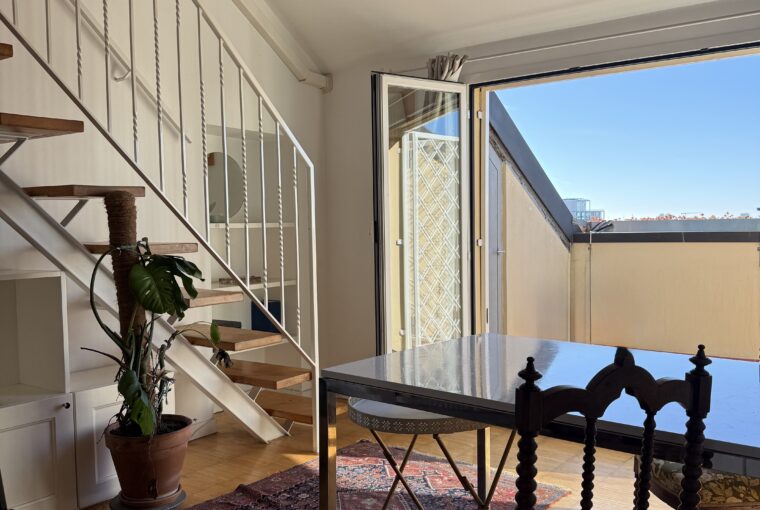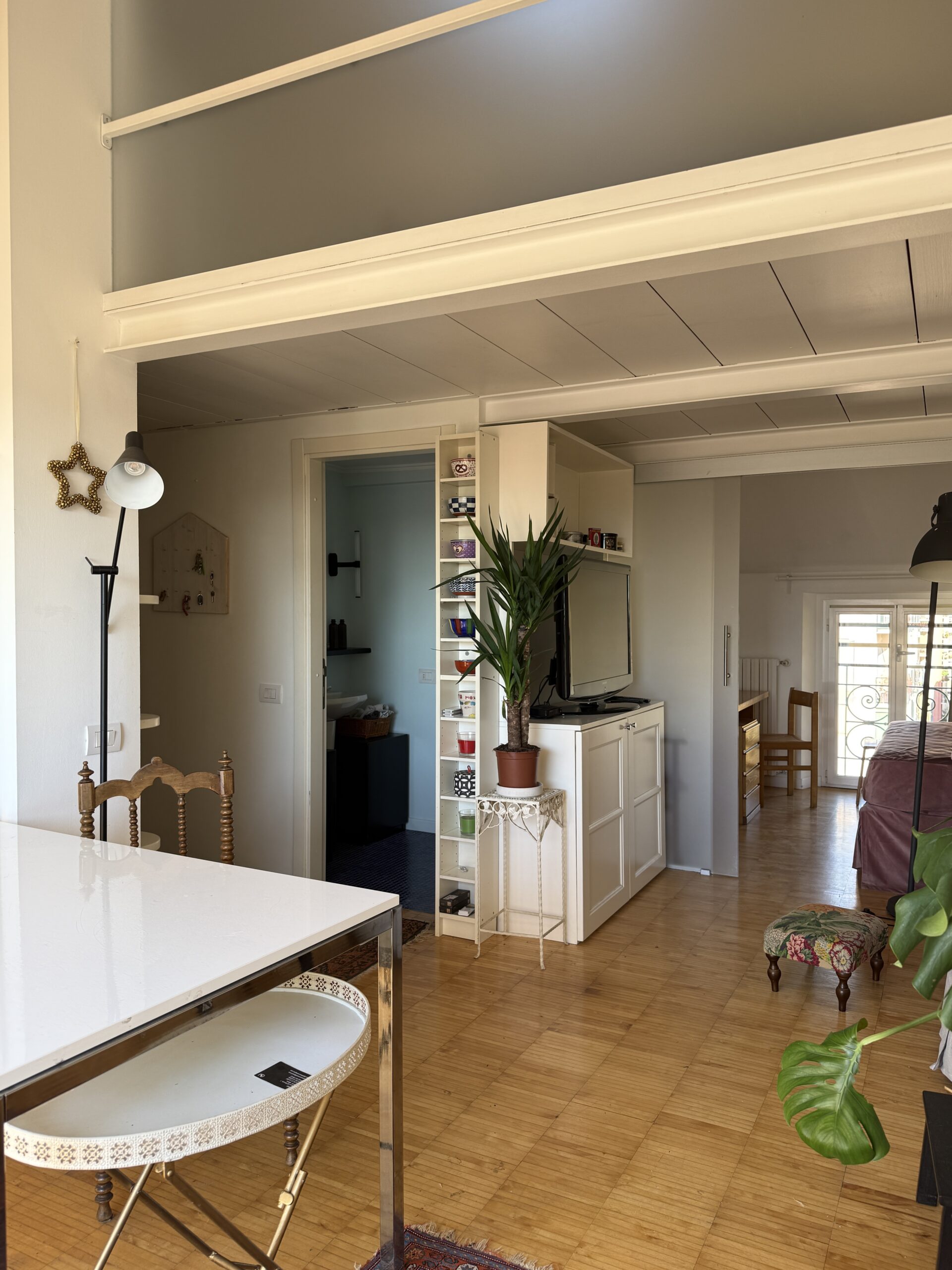 L’appartamento si sviluppa su due livelli: al primo, ampia zona giorno con cucina a vista attrezzata di tutti gli elettrodomestici, armadi a muro, una stanza studio con letto alla francese (separata dal soggiorno da una porta a vetri), il bagno e la lavanderia; al secondo livello, la stanza con letto matrimoniale e un’ampia cabina armadio.