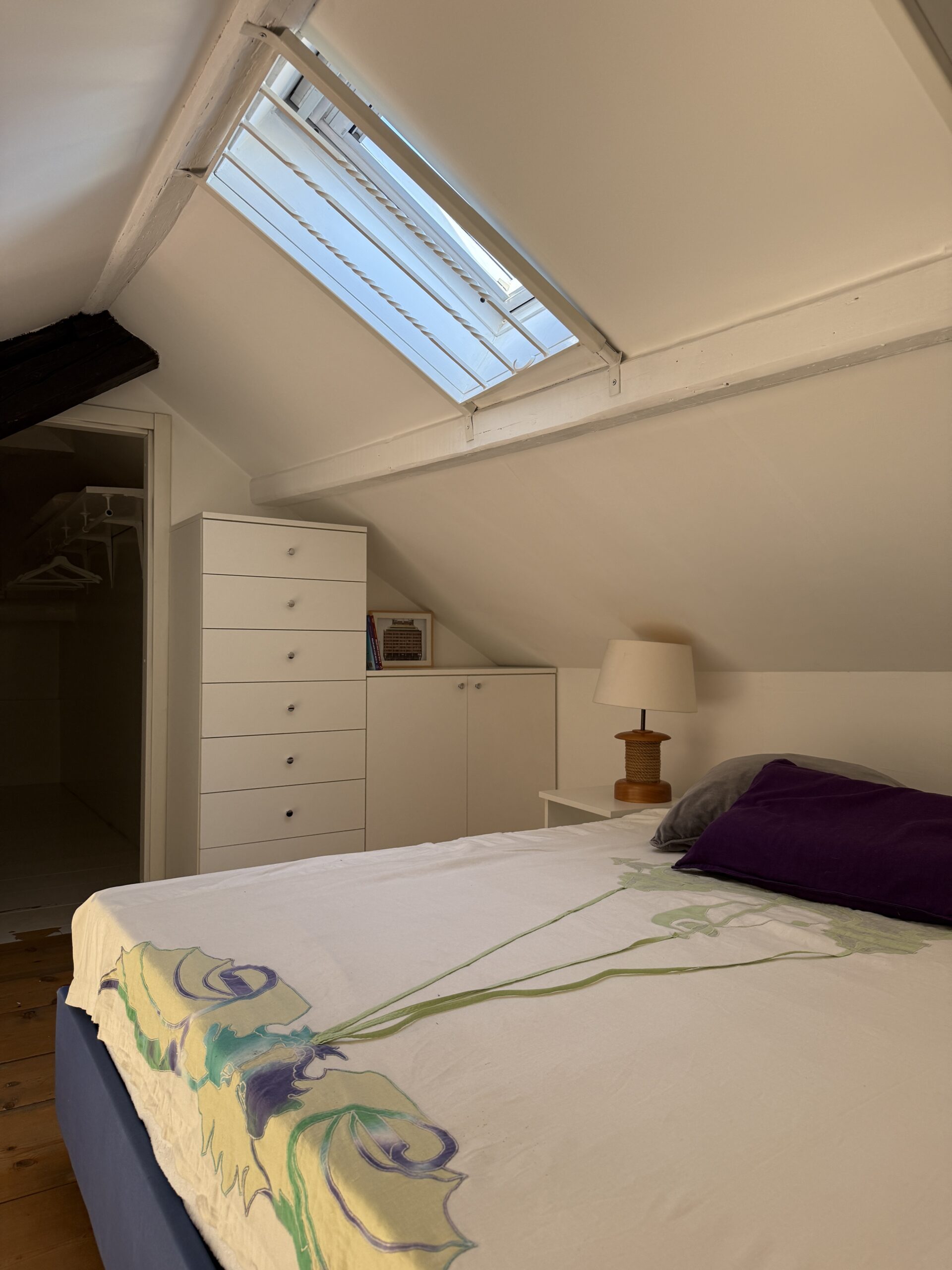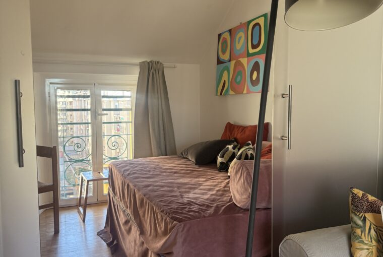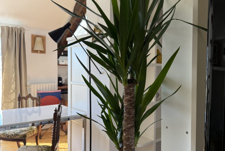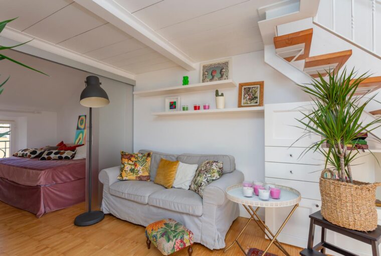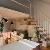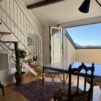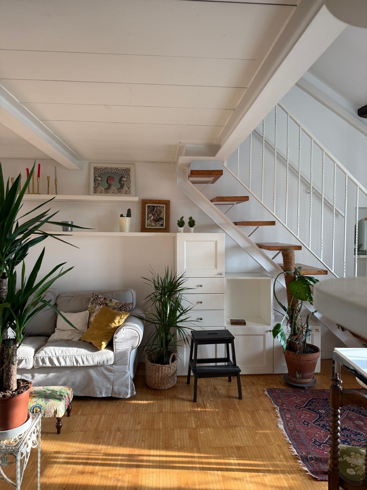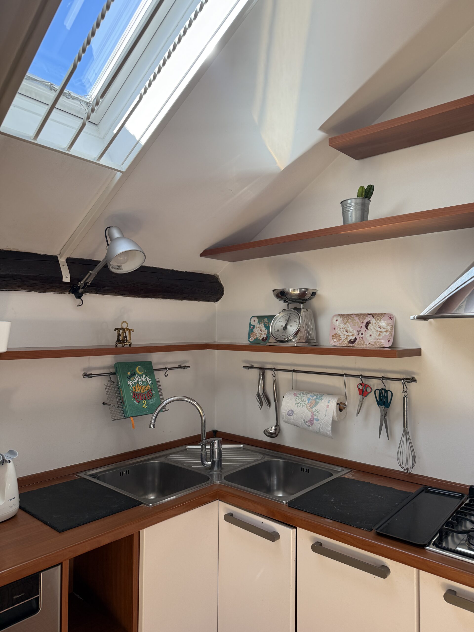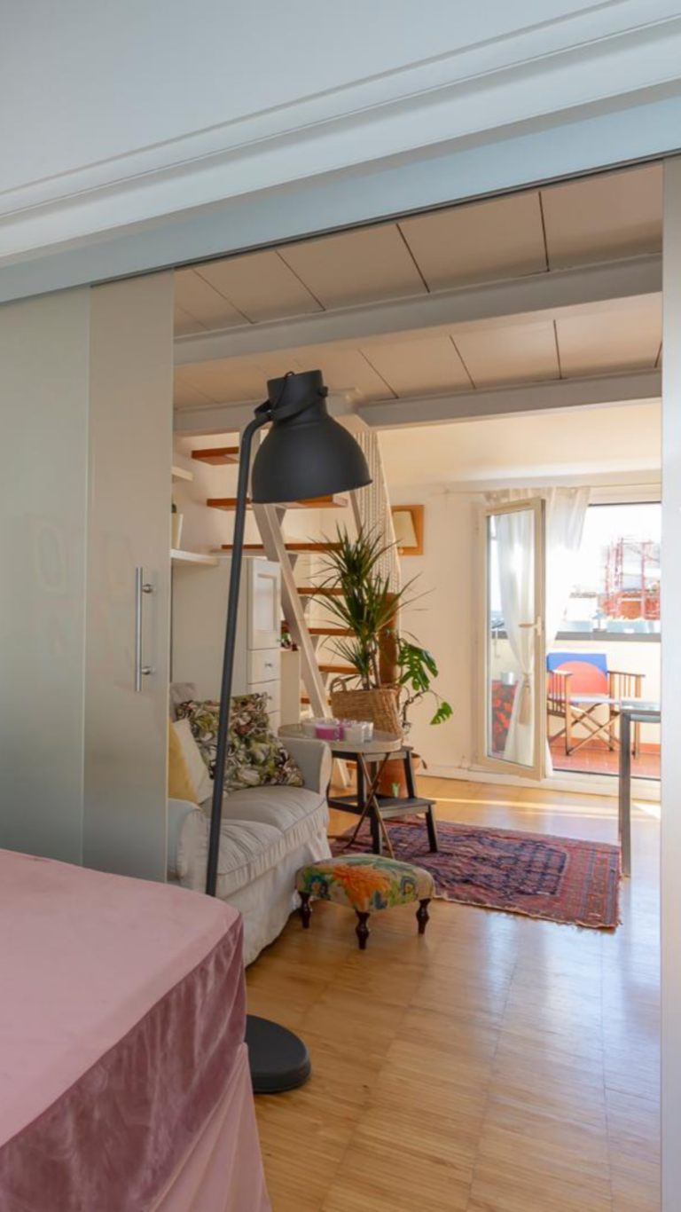 L’appartamento si sviluppa su due livelli: al primo, ampia zona giorno con cucina a vista attrezzata di tutti gli elettrodomestici, armadi a muro, una stanza studio con letto alla francese (separata dal soggiorno da una porta a vetri), il bagno e la lavanderia; al secondo livello, la stanza con letto matrimoniale e un’ampia cabina armadio.