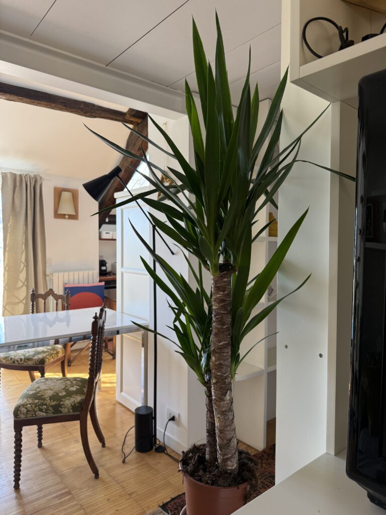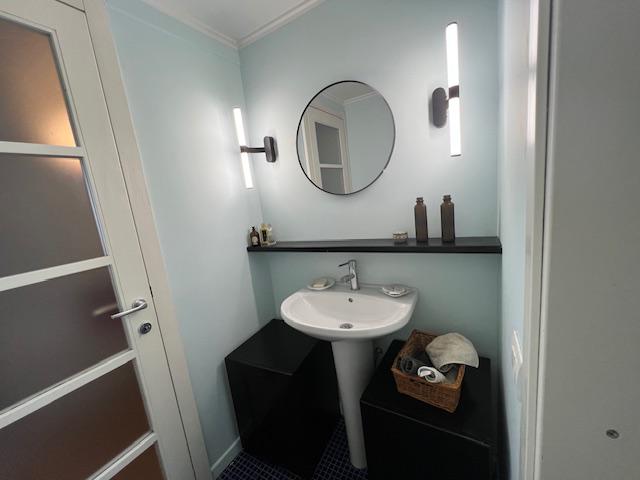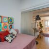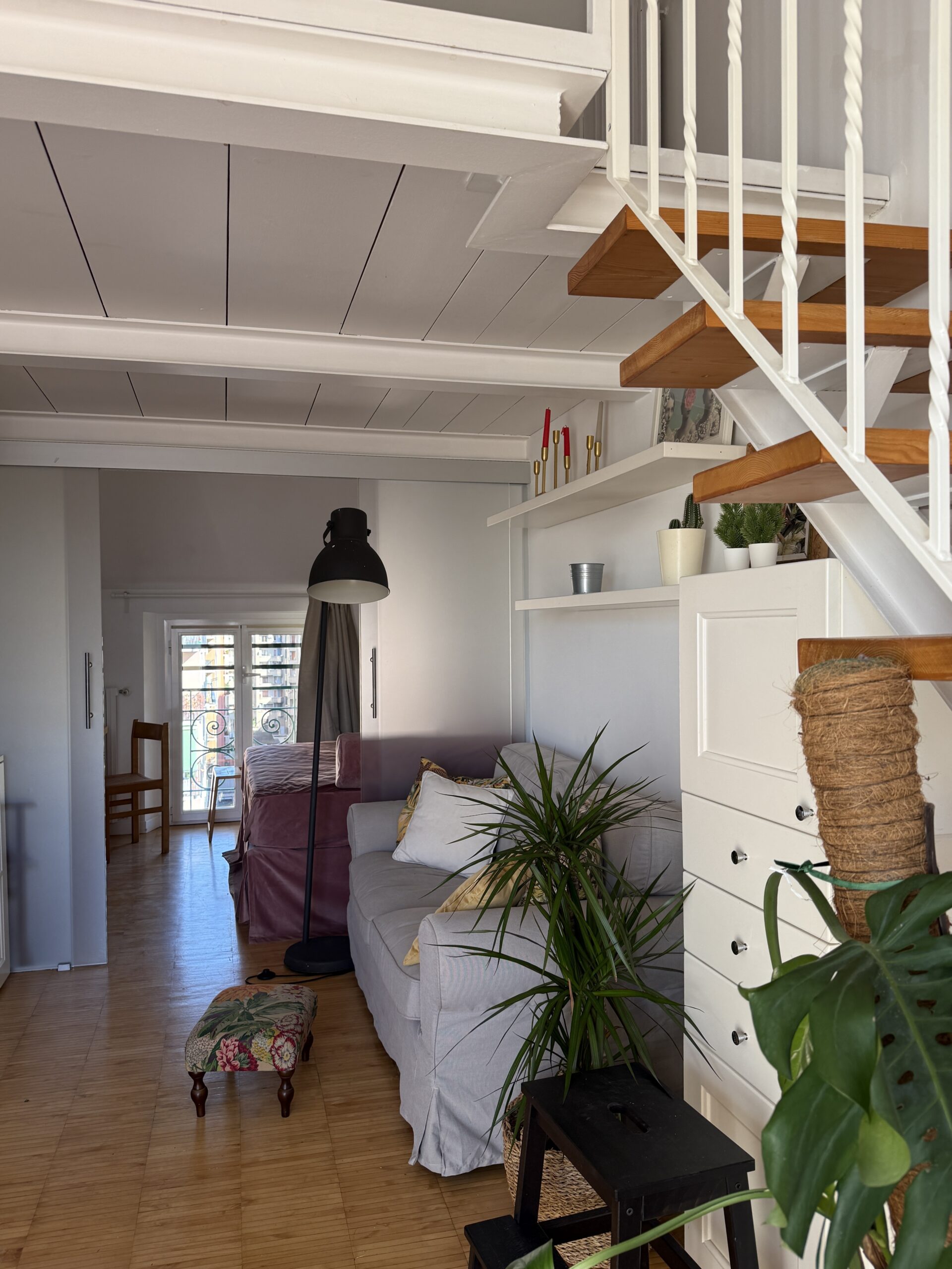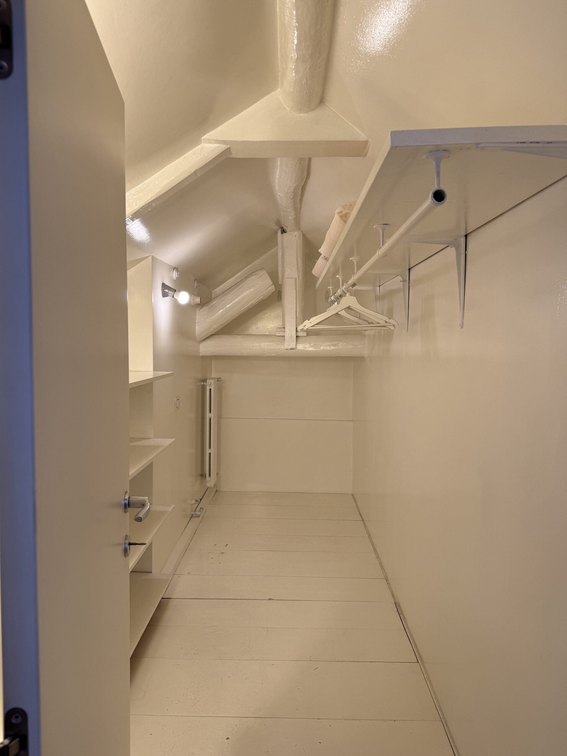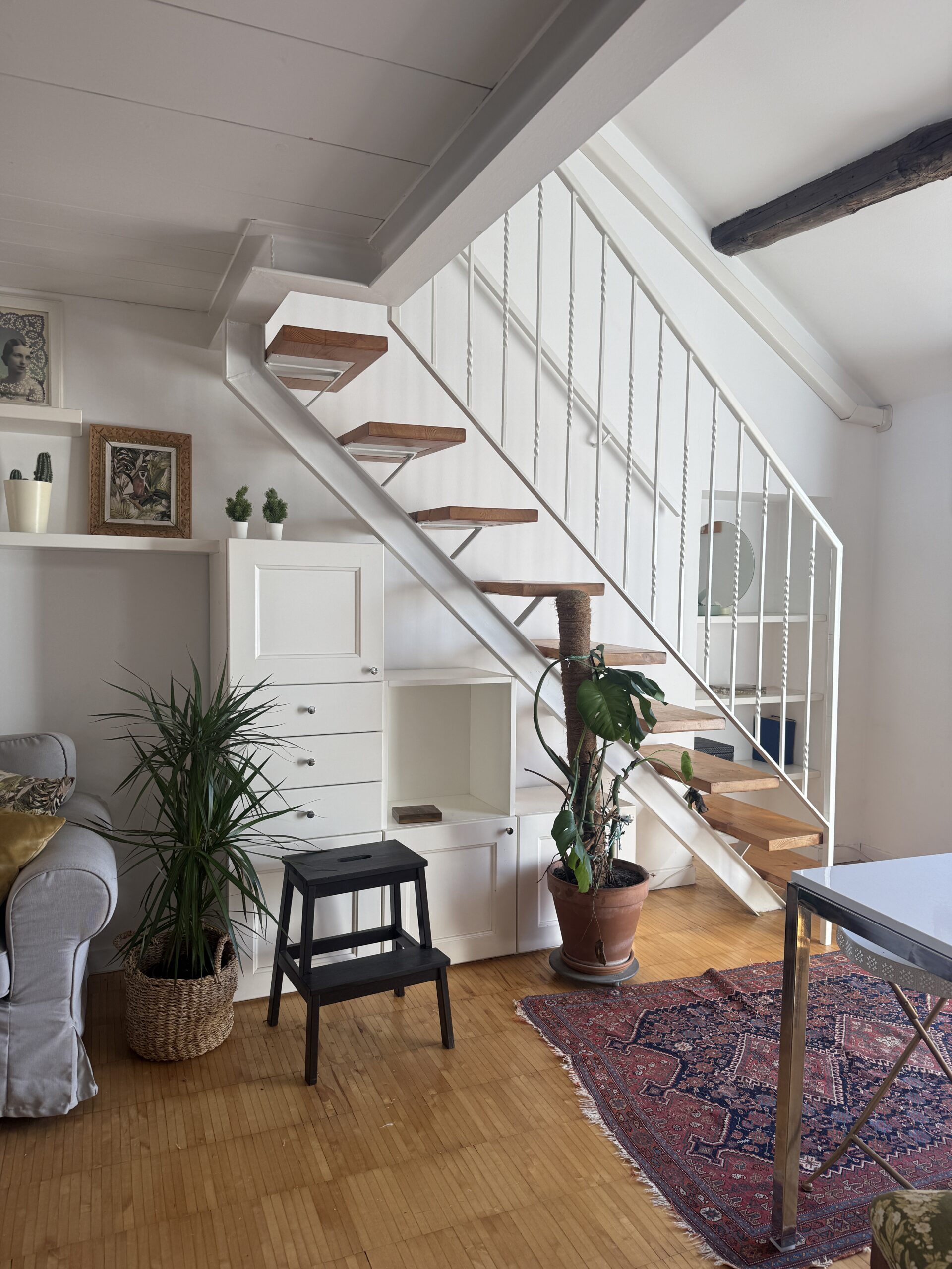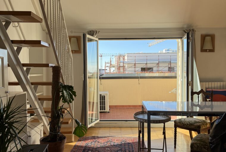 L’appartamento si sviluppa su due livelli: al primo, ampia zona giorno con cucina a vista attrezzata di tutti gli elettrodomestici, armadi a muro, una stanza studio con letto alla francese (separata dal soggiorno da una porta a vetri), il bagno e la lavanderia; al secondo livello, la stanza con letto matrimoniale e un’ampia cabina armadio.