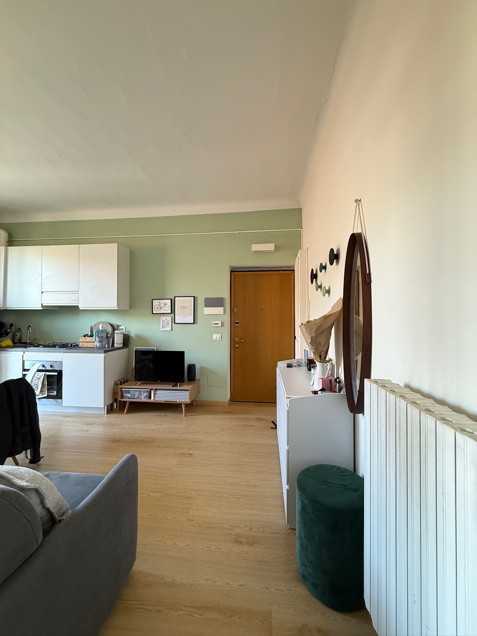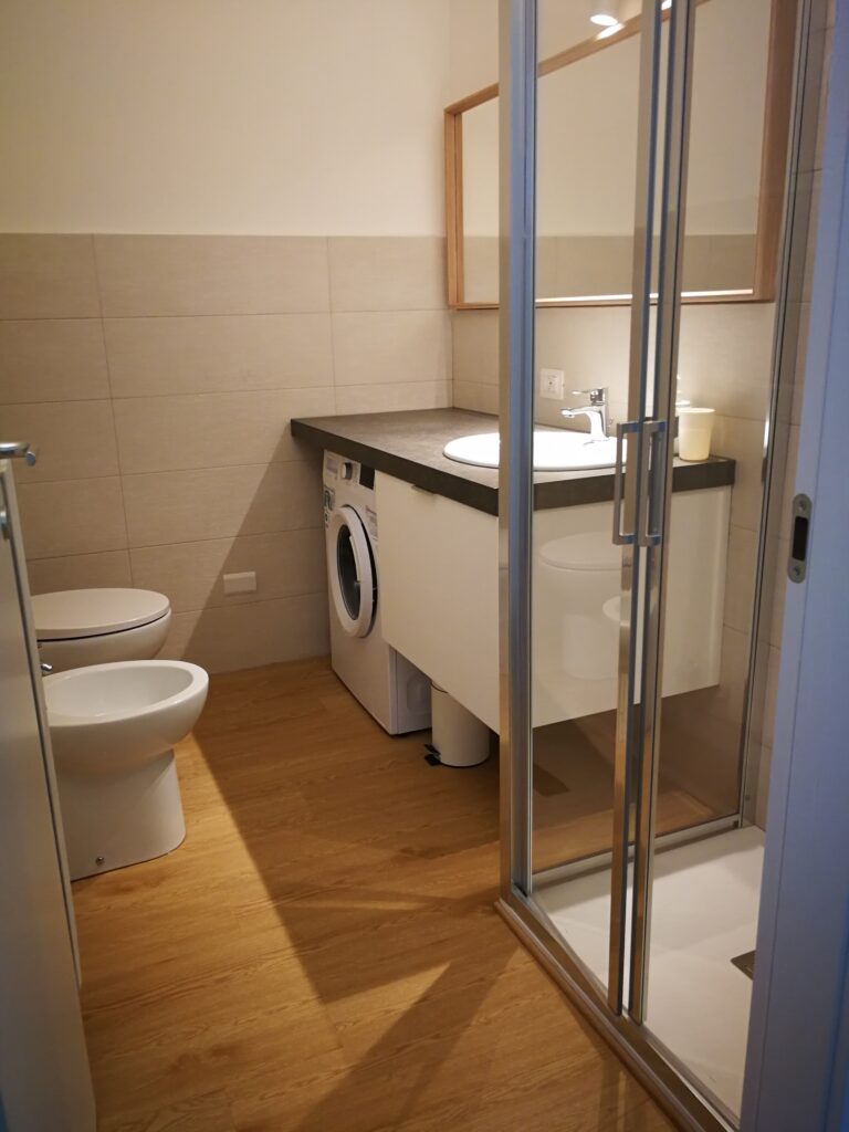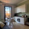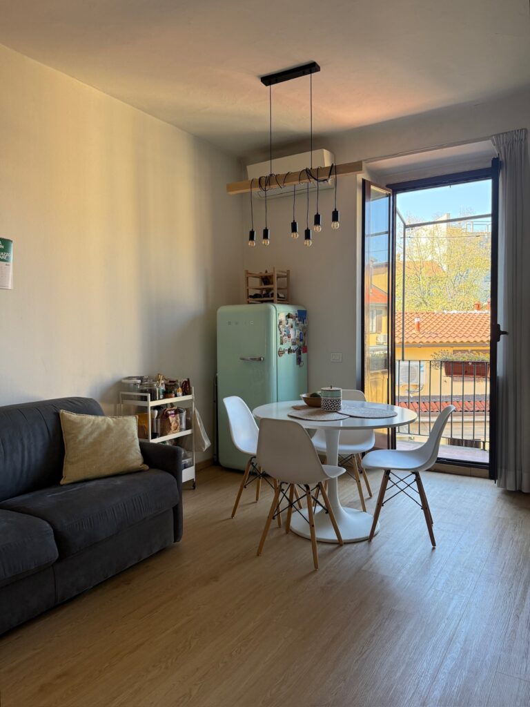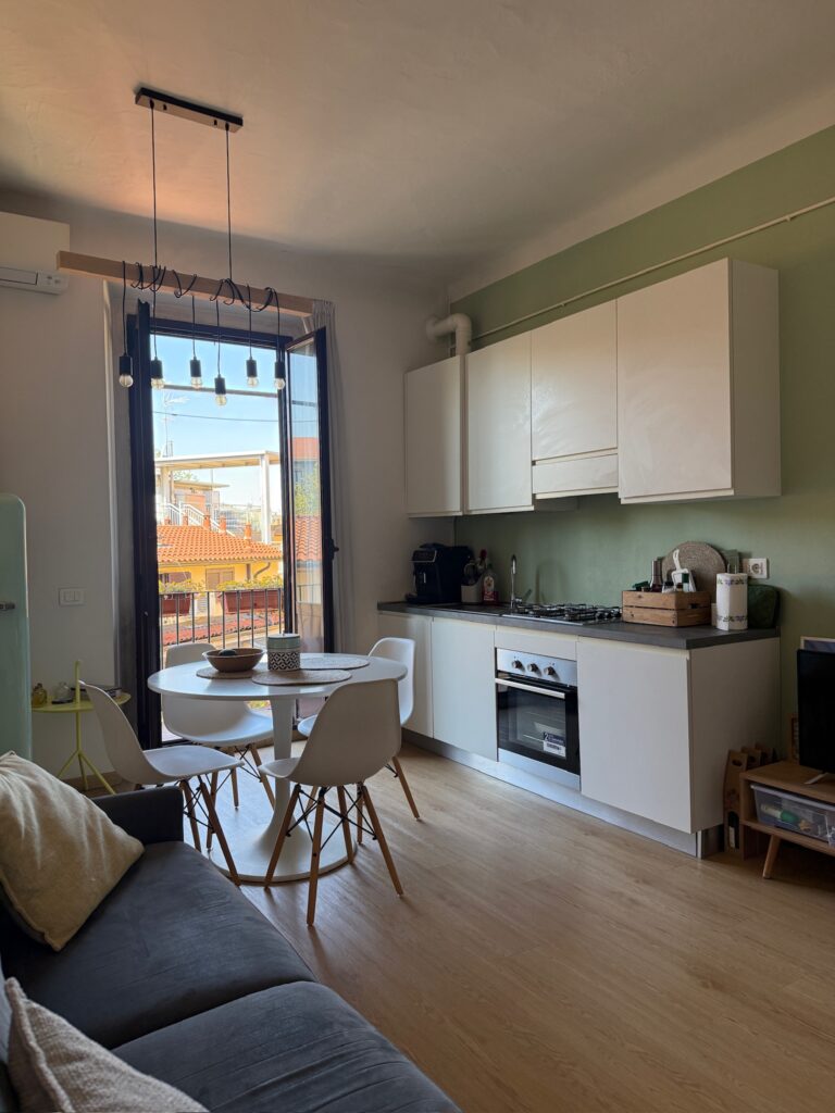 Si entra nel soggiorno con cucina a vista e un bel balcincino dove c’è spazio per un tavolino e due sedie. La camera da letto, con ampia armadiatura, ha due finestre e da una si può accedere al balcone. Nel bagno, completo, si trova anche la lavatrice.