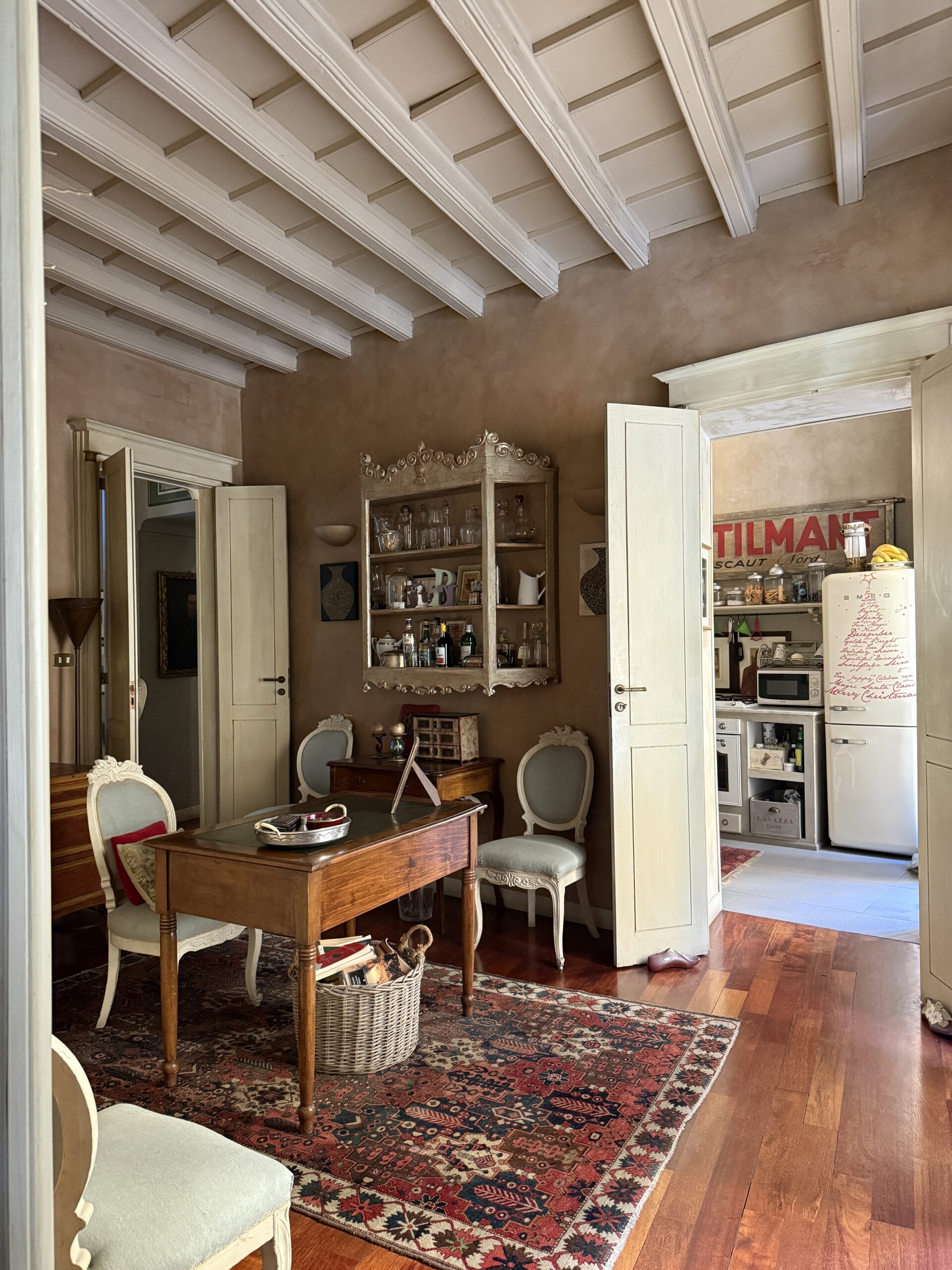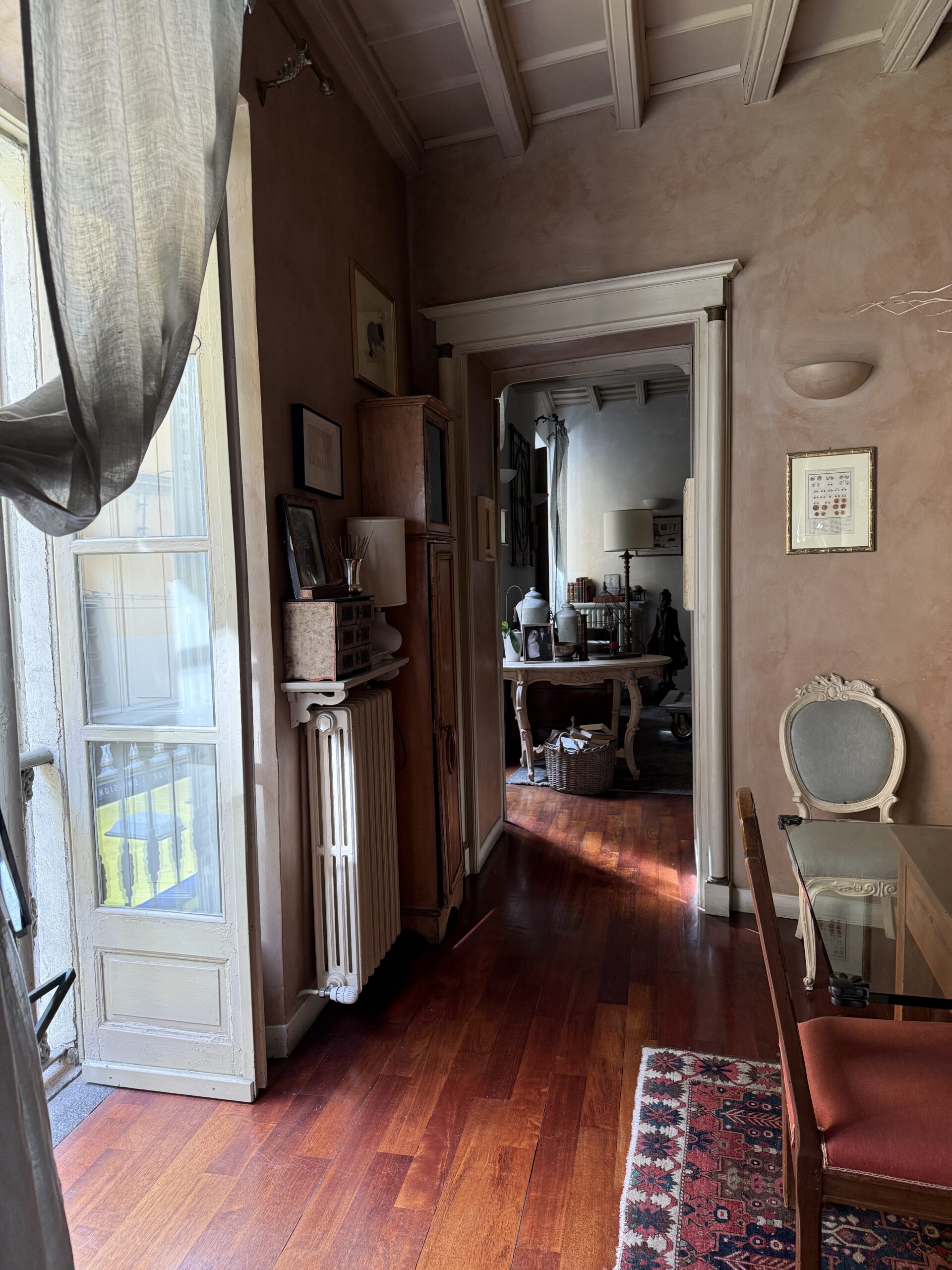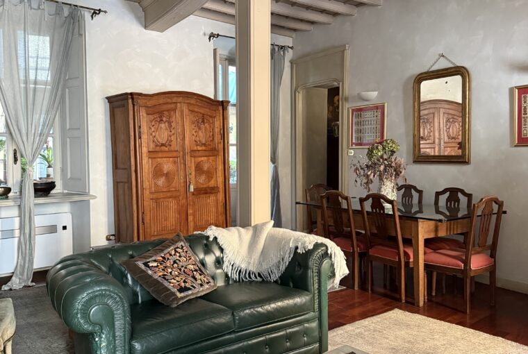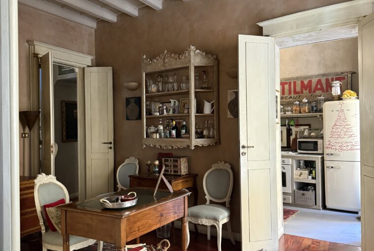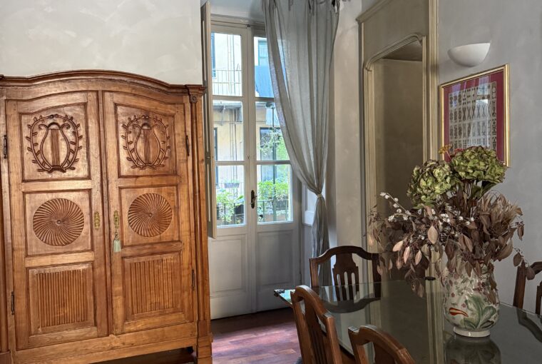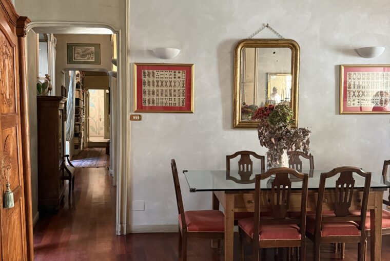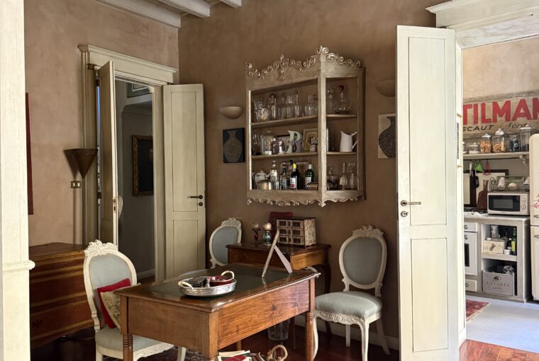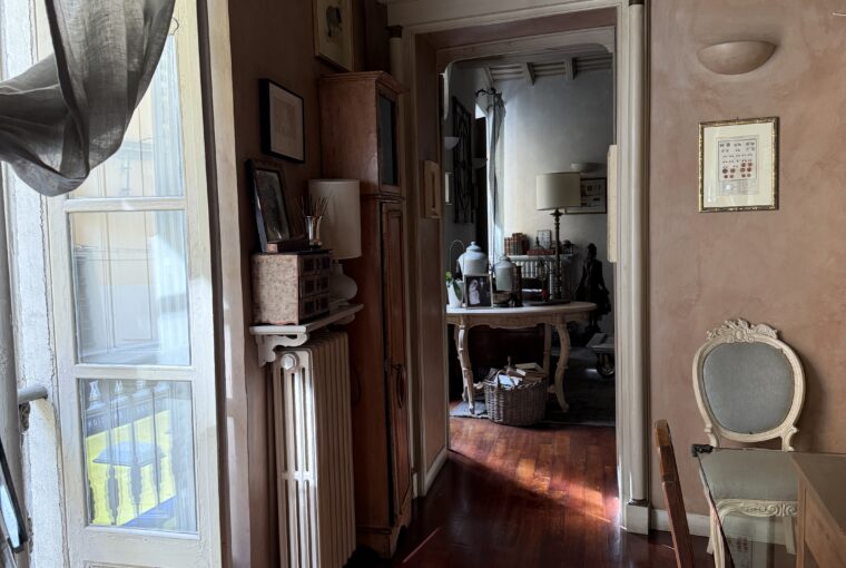 Attualmente è composto da ingresso su ampio soggiorno, due camere, cucina, cabina armadi, bagno padronale e bagnetto, cantina. Doppio affaccio Via Rossini e interno cortile. Soffitti a cassettoni, aria condizionata nella zona giorno, riscaldamento autonomo.