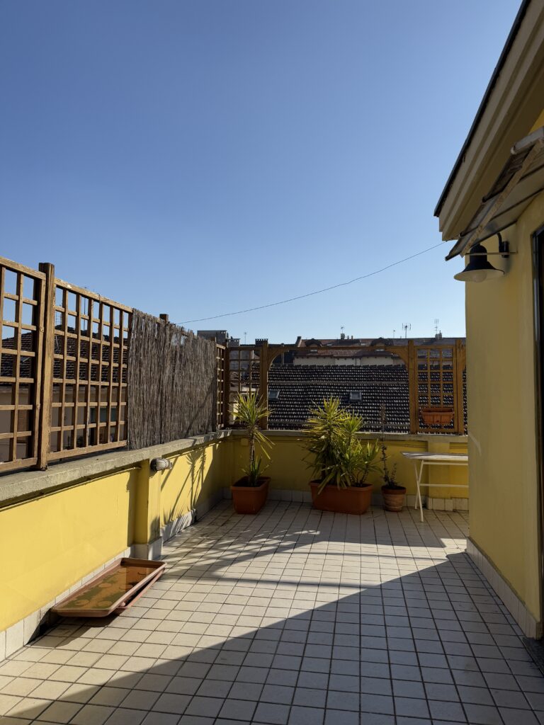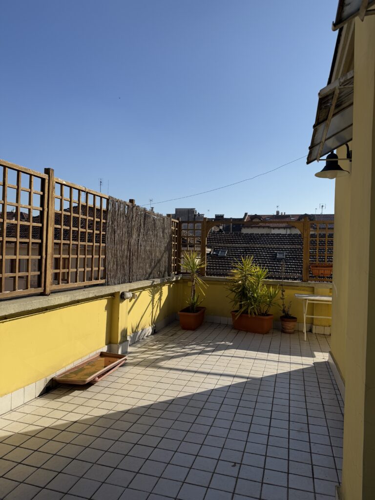 Zona Crocetta, stabile anni 60 con ascensore. Splendido attico con grande terrazzo che gira intorno alla casa, ultimo piano, ingresso, soggiorno, cucina abitabile, due camere da letto, due bagni con finestra. Tre arie. Appartamento vuoto con cucina arredata, aria condizionata. Libero subito.