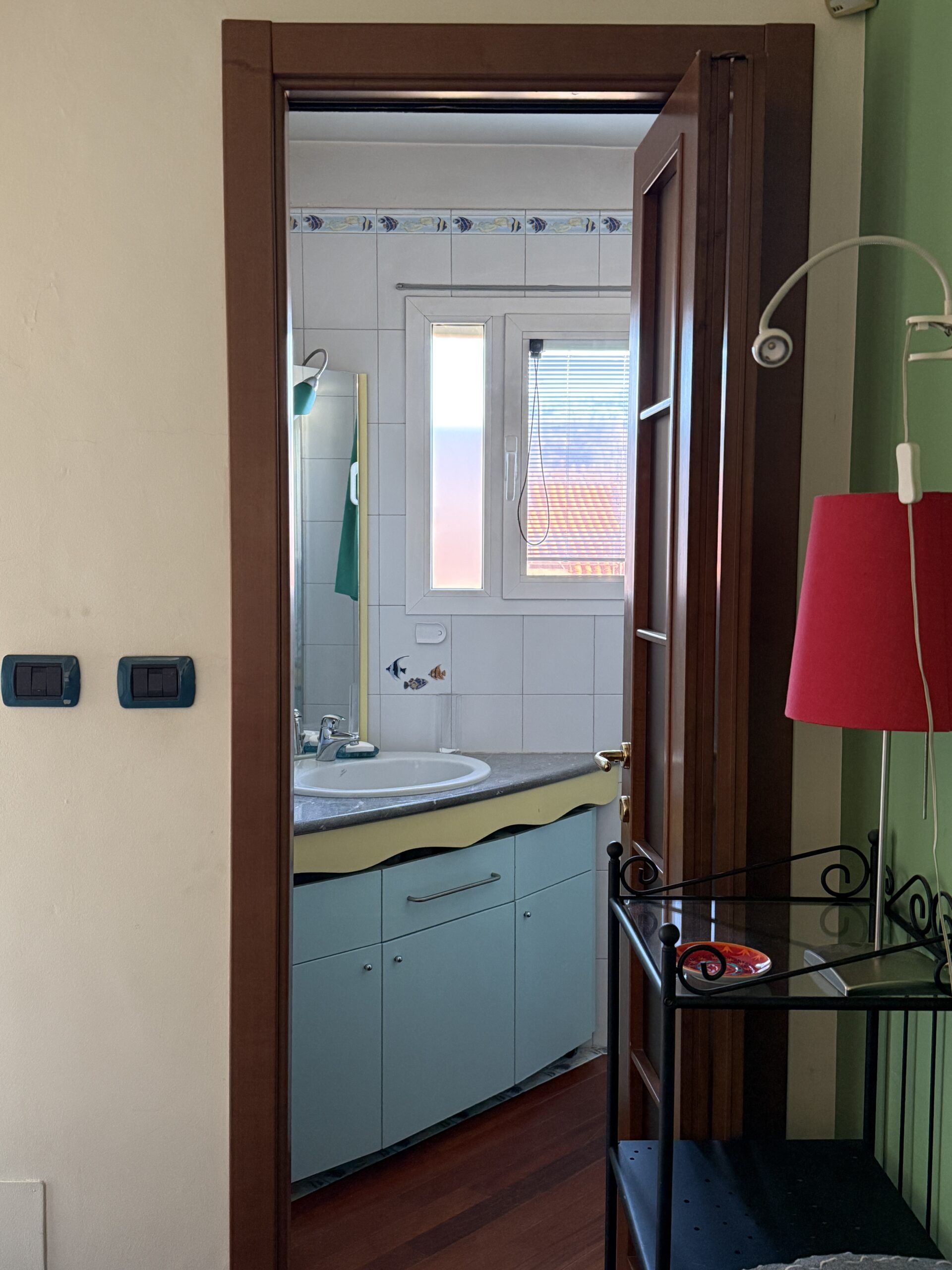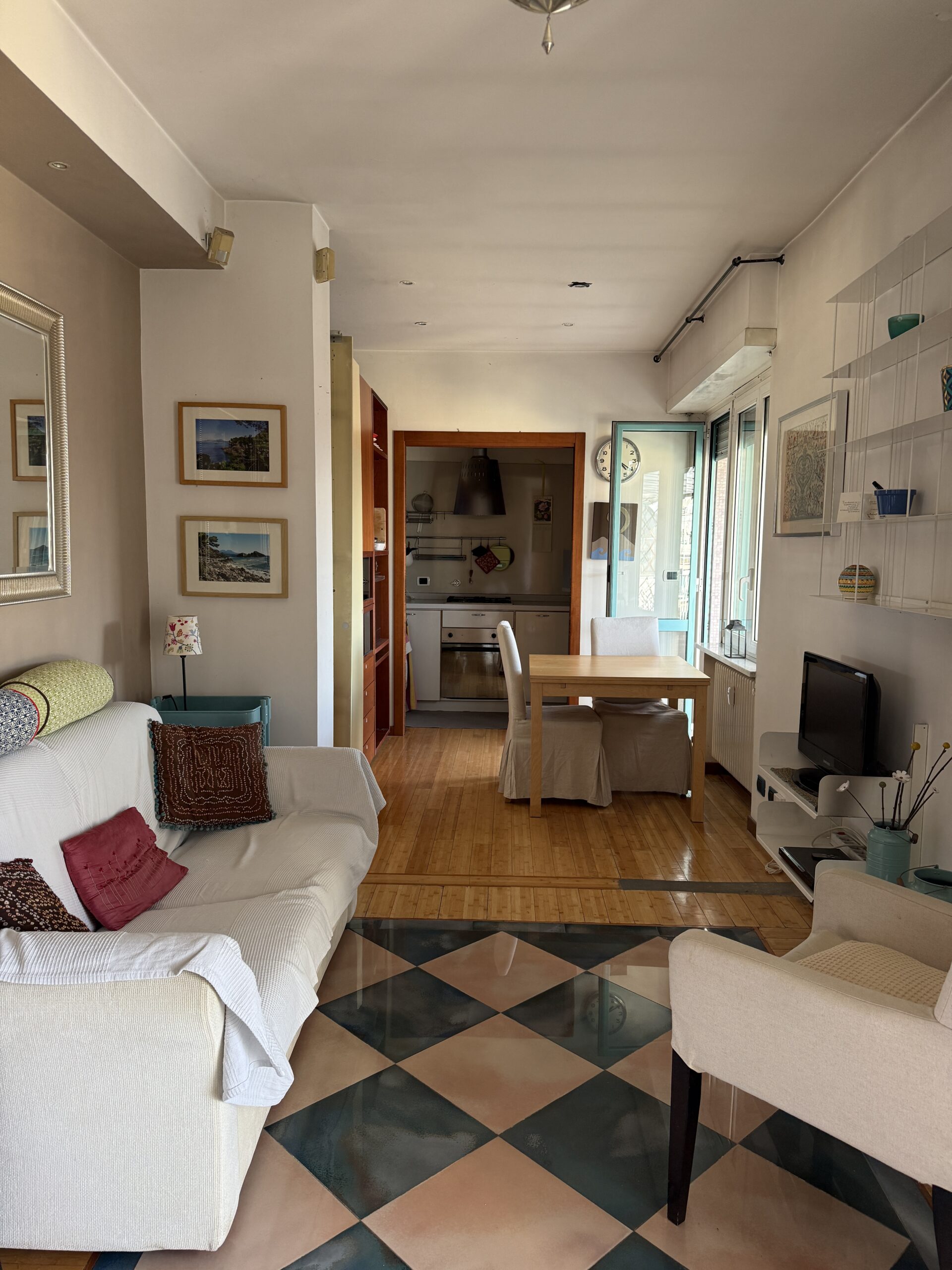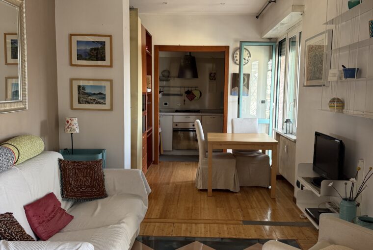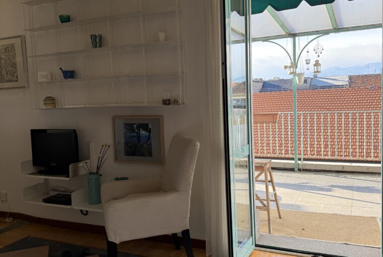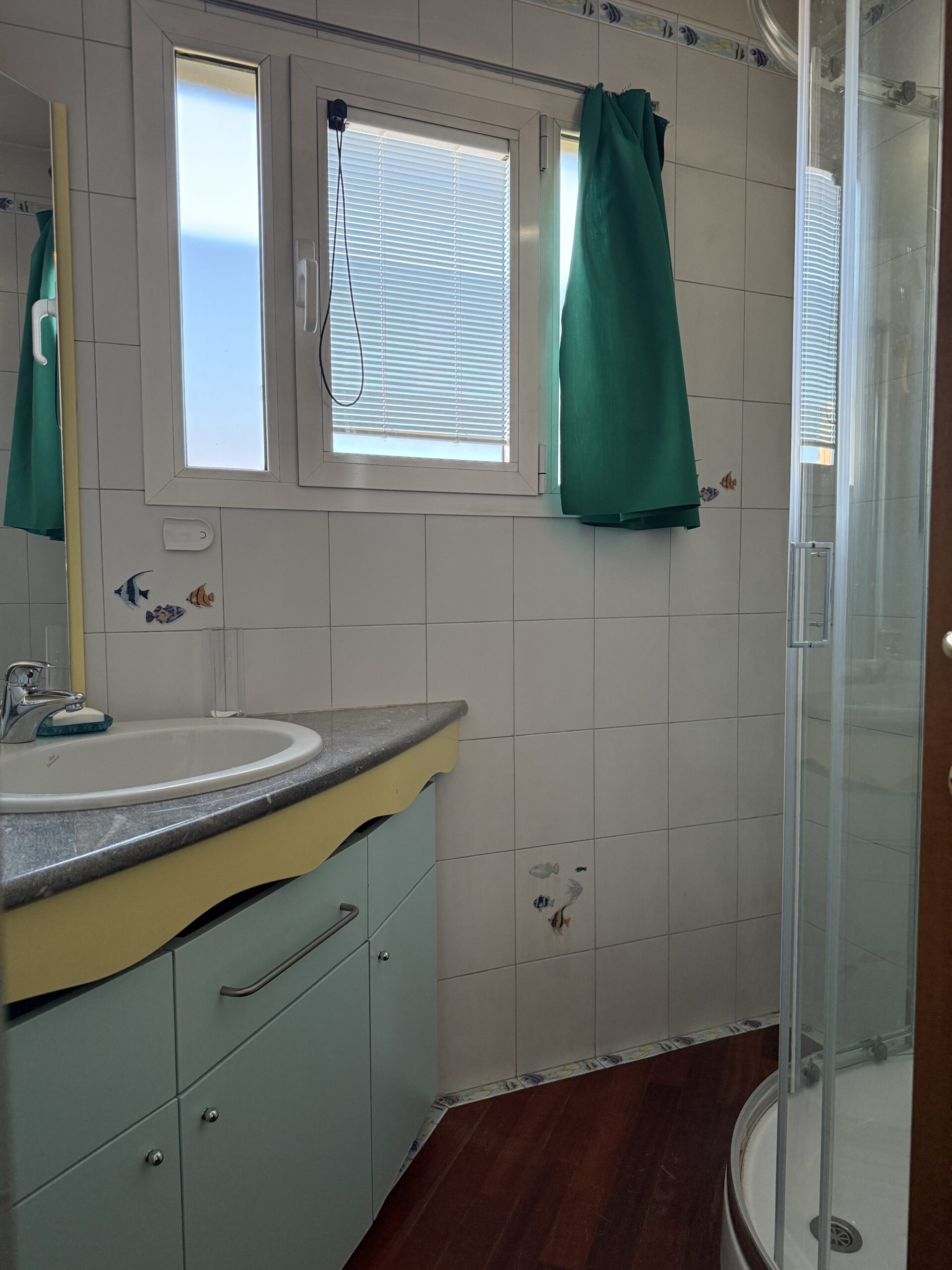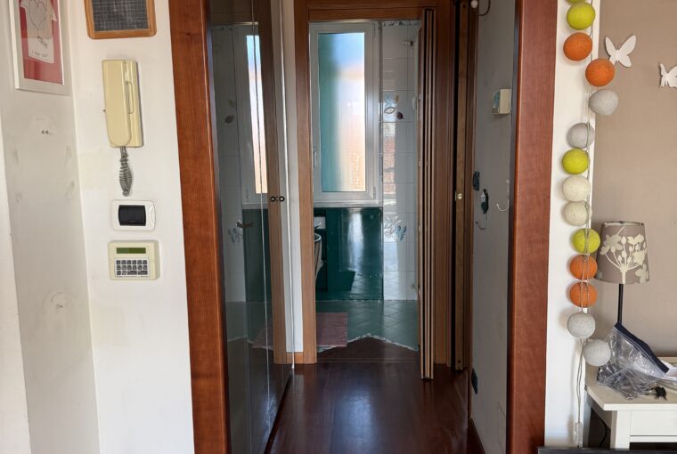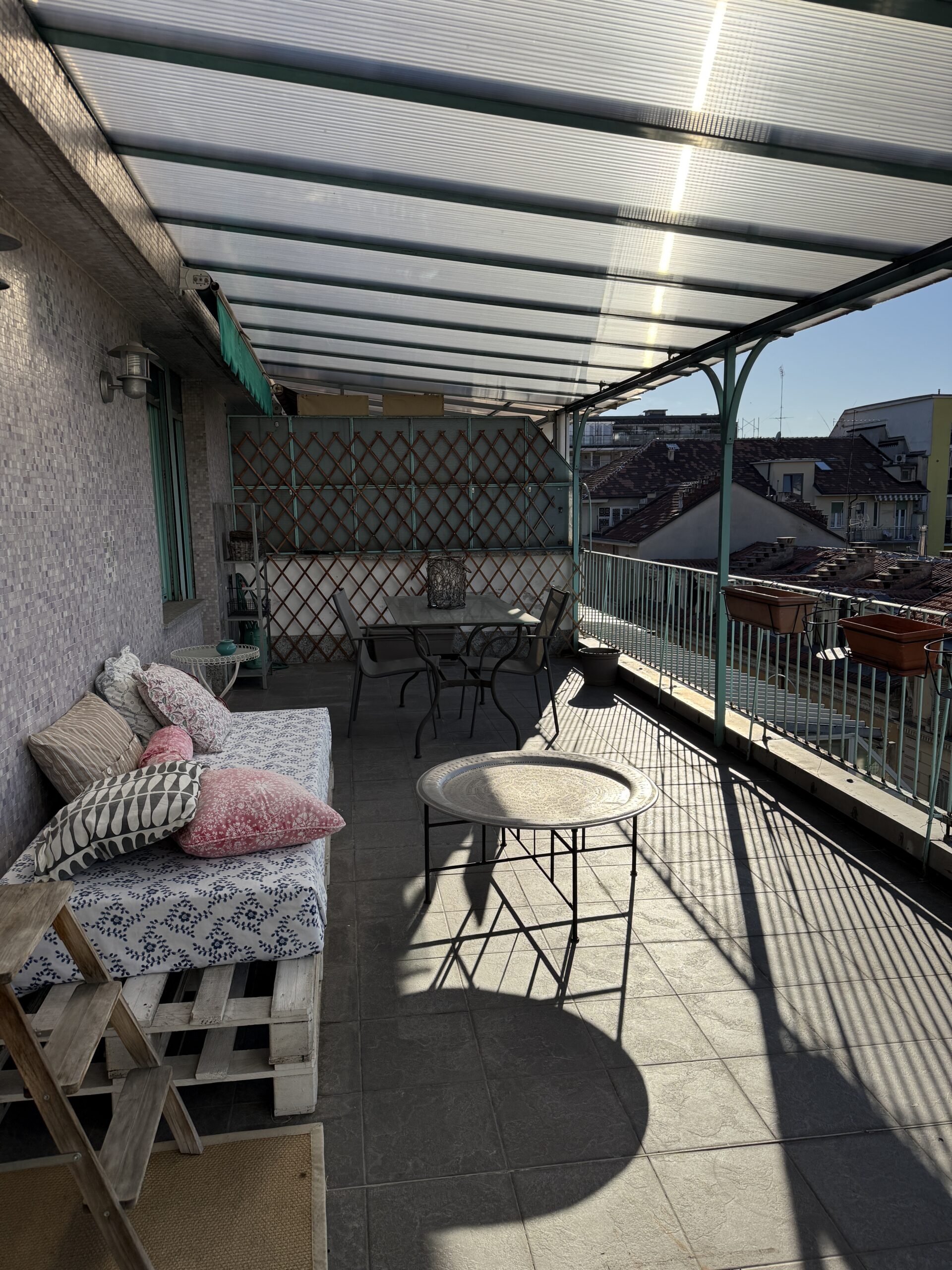 Opportunità unica per questo appartamento attico con un terrazzo di 27 mq. Ultimo piano con ascensore, ingresso su ampia zona giorno divisa in zona divano, zona pranzo e cucinino a vista volendo chiudibile. Camera da letto, bagno sdoppiato alla francese, ampio balcone lato cortile attrezzato a lavanderia e ripostiglio. Doppia aria parallela esposizione est-ovest soleggiatissimo con vista montagne e collina. Tutta la zona giorno affaccia sul grande terrazzo protetto da tettoia (nuova) che ci permette un arredo da utilizzare tutto l’anno. Tramonti stupendi dal terrazzo esposto ad ovest. L’appartamento ha l’aria condizionata, riscaldamento centralizzato, cantina, porta blindata e viene venduto volendo dotato di arredi come da fotografie.
